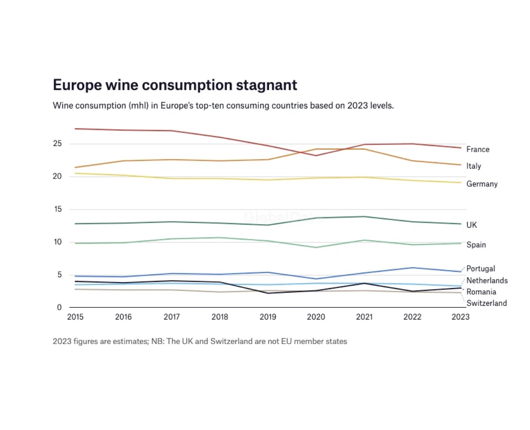 In 2023, EU member states represented 48% of global wine consumption – drinking 107 million hectolitres. This figure reflected a