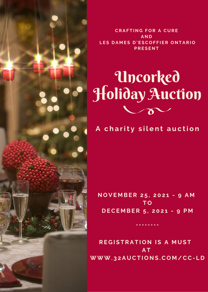 Save the Date: Les Dames d’Escoffier Ontario’s “Uncorked Holiday Edition,” virtual silent auction commences November 25th and will run through to December 5th! Opportunity knocks and bottles pop! Crafting For a Cure is pleased to host “Uncorked” – a wine and gift basket silent auction supporting of two critically important causes. Bid on our fantastic […]